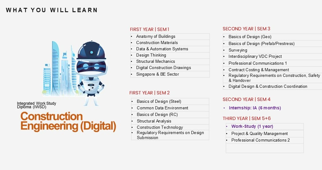 The Diploma in Construction Engineering (Digital) has all the core engineering courses and the relevant digital skillsets that will transform Singapore’s construction industry towards a more sustainable, productive and SMART industry.