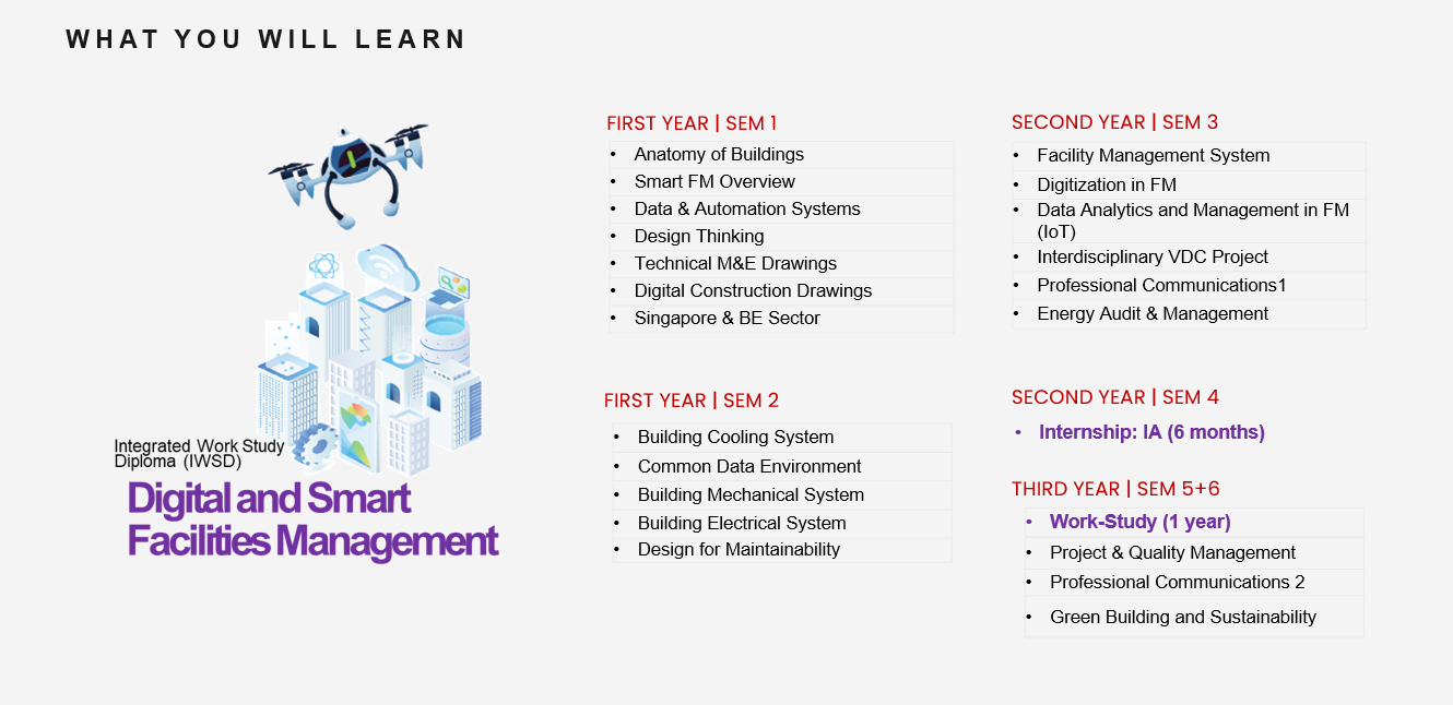 Digitalisation is a critical enabler in transforming Singapore into a smarter, greener and more liveable city. The Integrated Work Study Diploma Programme, which strongly focuses on digitalisation applied through stages of a building’s design, construction to operations, will future-proof our graduates to take on exciting roles to shape Singapore’s future.